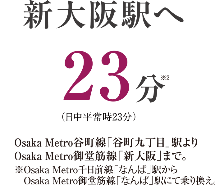 - ※2 目的駅への到着時刻を午前8時30分と設定して算出した所要時間(カッコ内は日中平常時)を表示しております。※「駅すぱあと」調べ。(2025年6月現在)「駅すぱあと」の算定に基づき、上記所要時間に待ち時間、乗換時間を含んでおります。